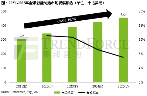 ,受惠于新冠疫情之下数字化转型加快,以及远端作业、自动化等需求进步,并带着5G、深化AI技能等加值服务,推升2021年全球智能制作商场规模至3050亿美元,预期至2025年有望达4500亿美元,年复合生长率达10.5%,将迎来制作业黄金五年。以下为具体内容: