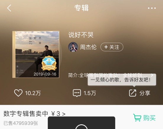 周杰伦的这首新单曲在 QQ 音乐上以 3 元的价格出售,现在已售出超 470 万份,保藏超越 10 万,谈论超 3 万。