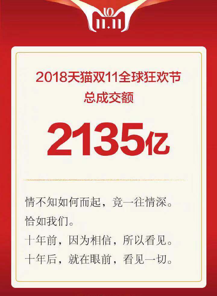 据天猫官方微博音讯,2018天猫双11全球狂欢节全天成交额为 2135 亿元。