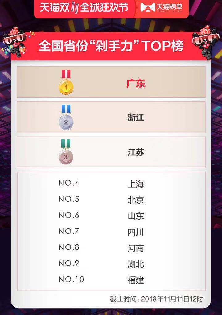 据未审计的数据剖析,天猫上“剁手力”排榜首的省份是广东,其次分别是浙江、江苏、上海、北京、山东、四川、河南、湖北、福建。